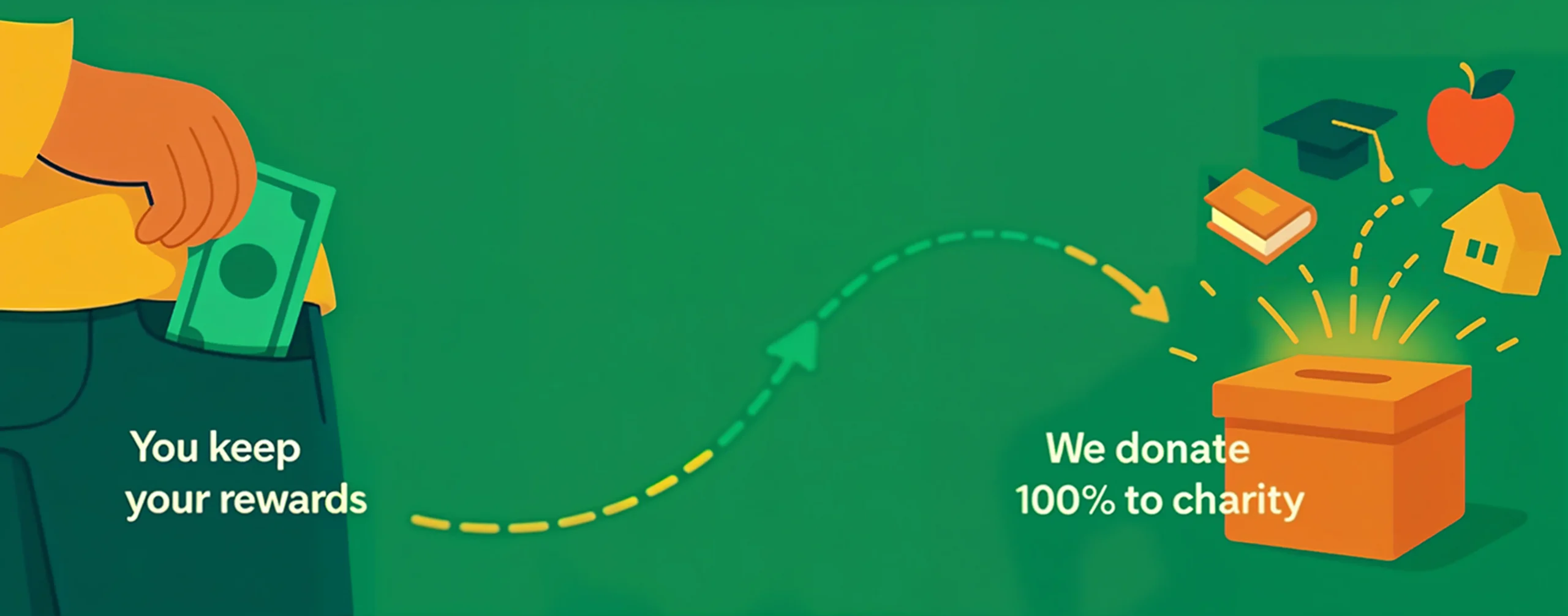 You keep your rewards – we donate 100% pf referral proceeds to charity.
